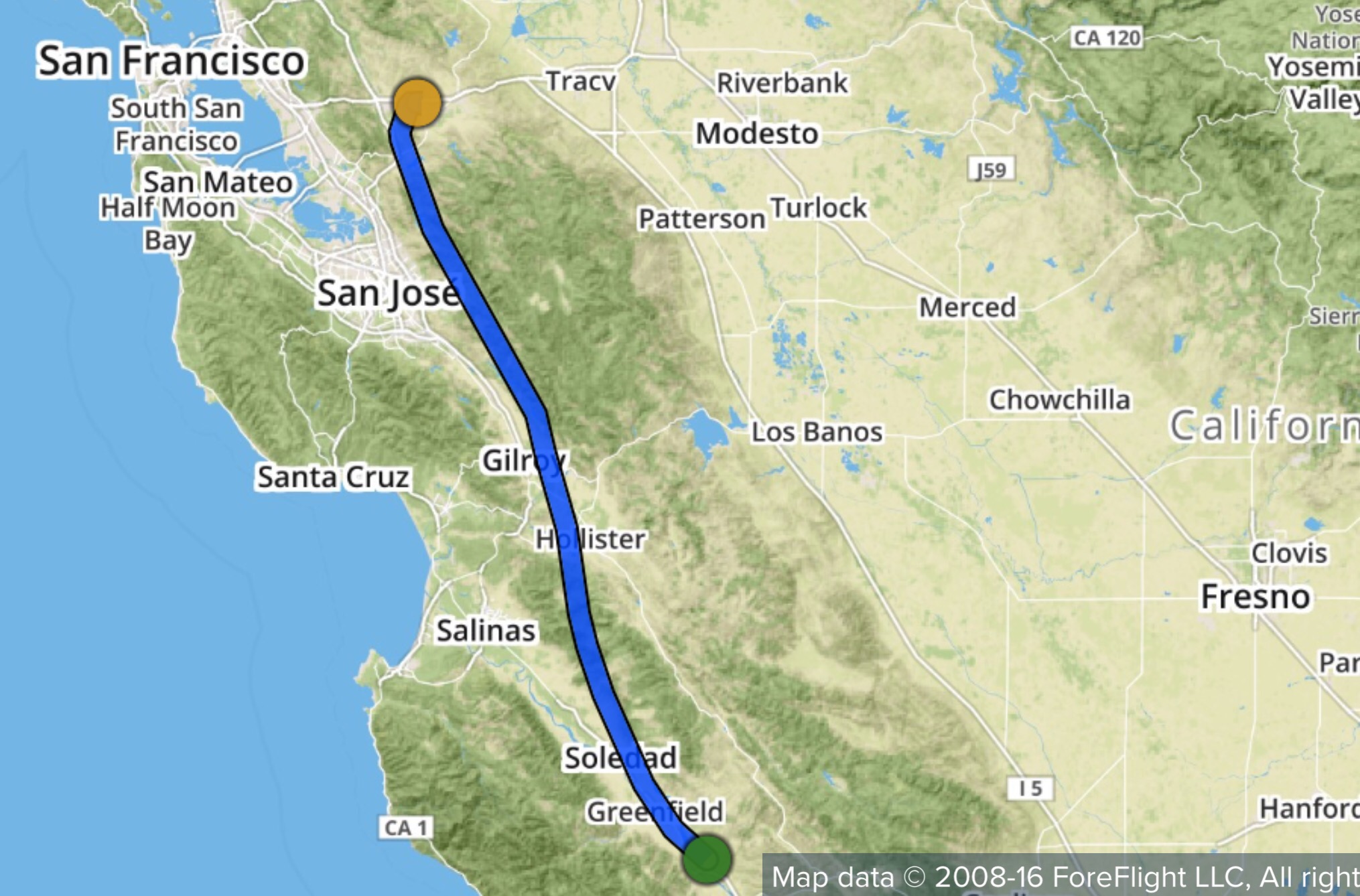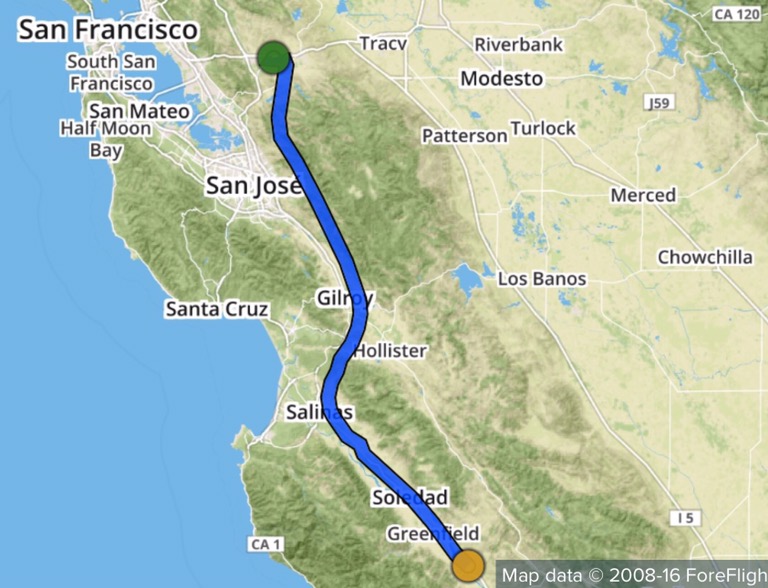 The course was to fly heading 84 (after wind correction at altitude) out of Livermore. That would have me skirting along the south end of restricted area R-2531 all the way to where I-5 meets I-580. At that point I turn to heading 121 to Gustine (3O1). I was doing 100kts airspeed with 128kts ground speed with a healthy tailwind at 5500′. My estimate was 110kts with an airspeed with 100 kts.
